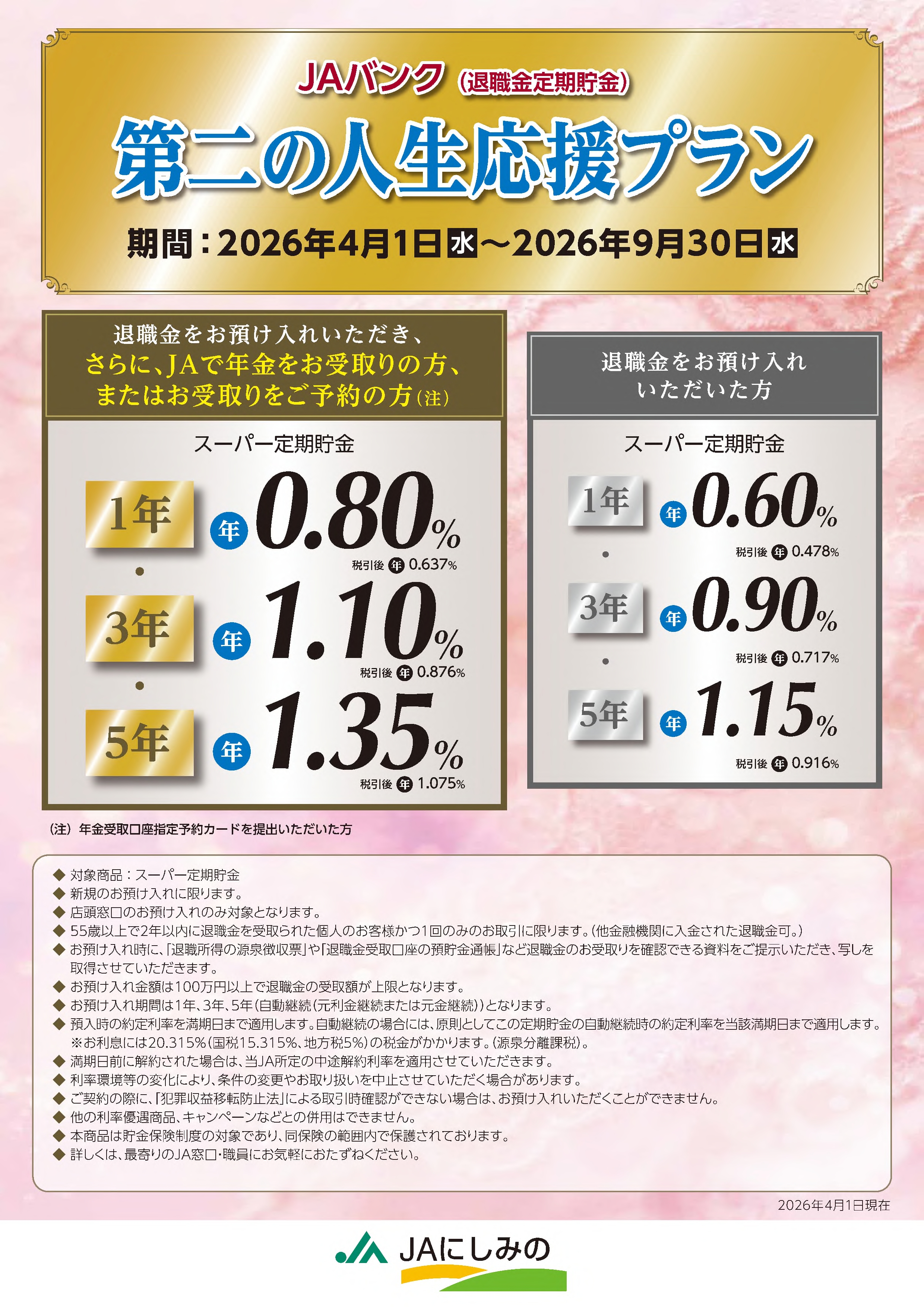 ただいまJAにしみのでは、JAバンク退職金定期貯金”第二の人生応援プラン”を実施しています。