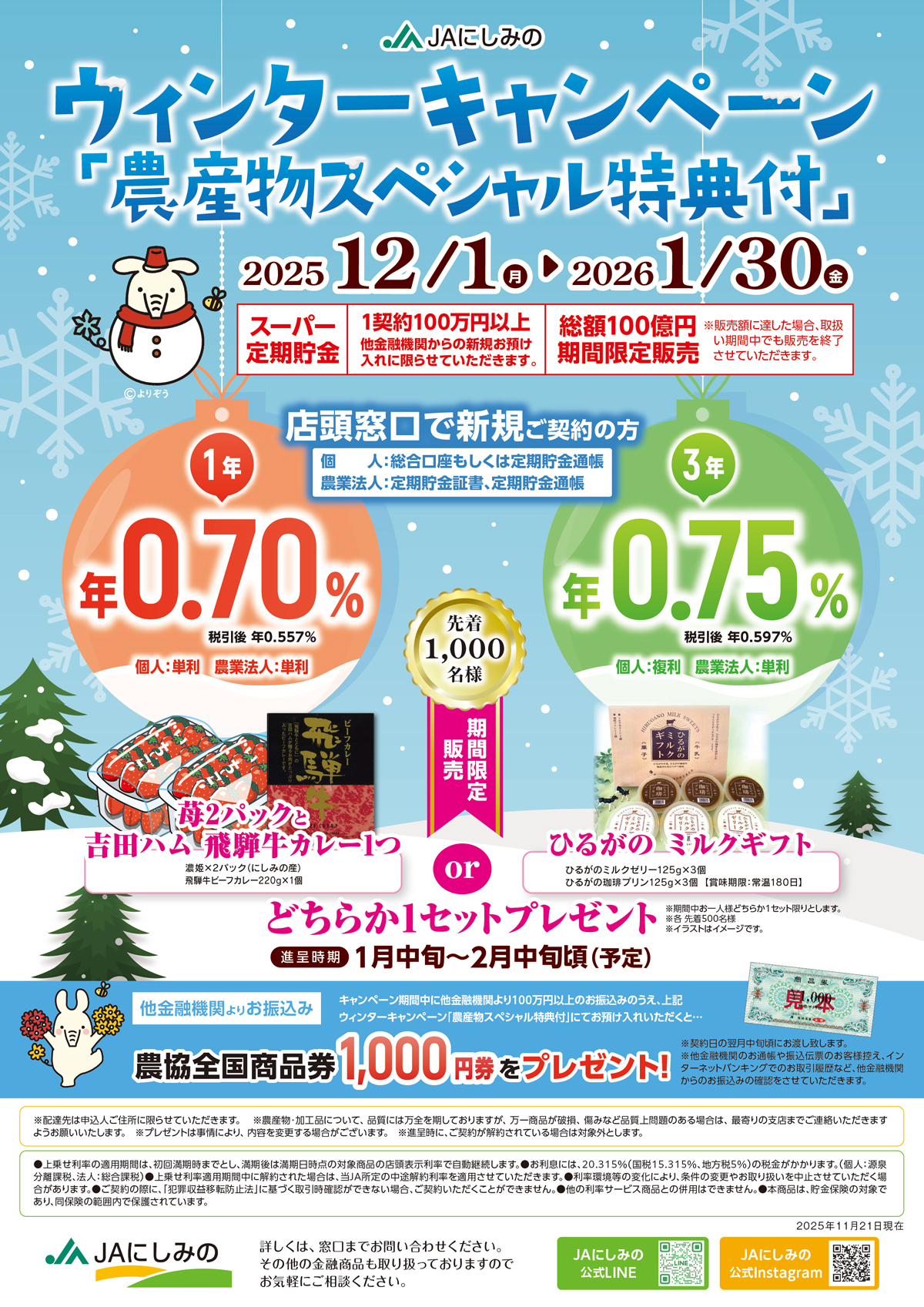 他金融機関より、キャンペーン期間中に100万円以上のお振込みのうえ、上記ウィンターキャンペーン「農産物スペシャル特典付」にお預け入れいただいた方に「農協全国商品券1,000円券」をプレゼント!